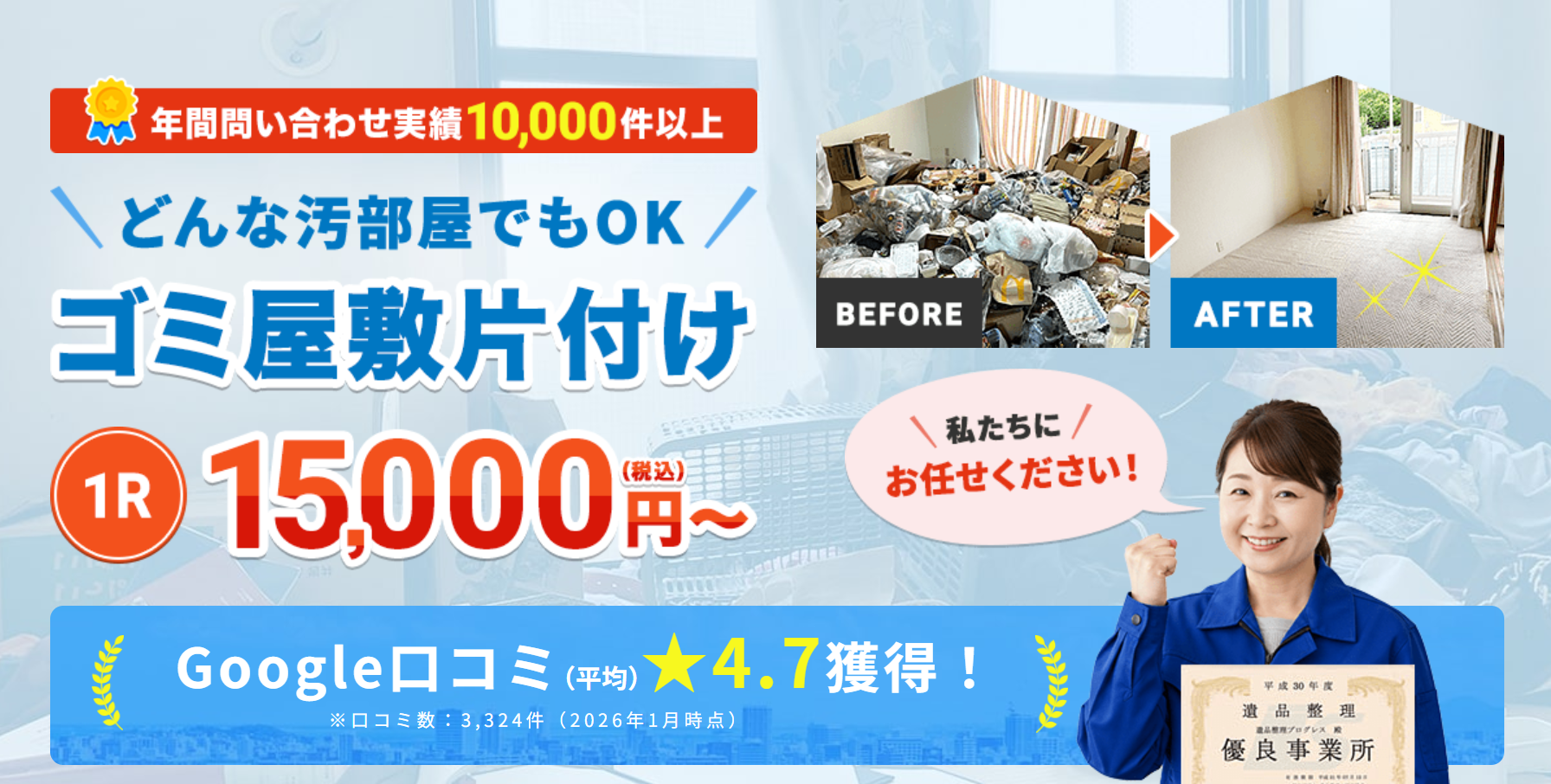 料金は「お部屋の広さに合わせた個別見積もり」を基本としており、正確な金額を提示。不用品回収、買取、消臭・消毒作業まで一貫して対応可能。どんなに深刻な状況でも、笑顔を取り戻せるような誠実なサービスが自慢です。