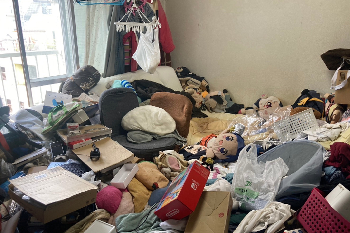 清掃前のお部屋は、床が見えないほど大量の衣類、段ボール、生活ゴミで埋め尽くされていました。中にはゲーム機の箱やぬいぐるみ、ハンガーに掛かったままの服なども散乱しており、生活動線が完全に失われている状態でした。