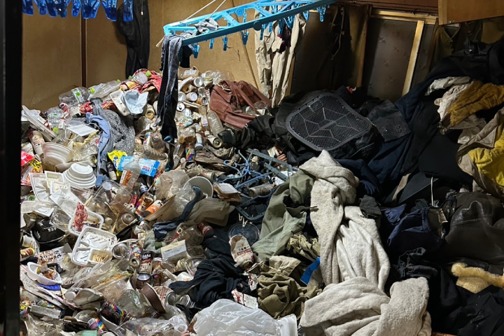 清掃前のお部屋は、床が見えないほど大量の衣類、段ボール、雑誌、生活ゴミで埋め尽くされていました。特に和室は、布団や衣類が山積みになり、壁のシミやカビも目立つ状態で、生活動線が完全に失われていました。