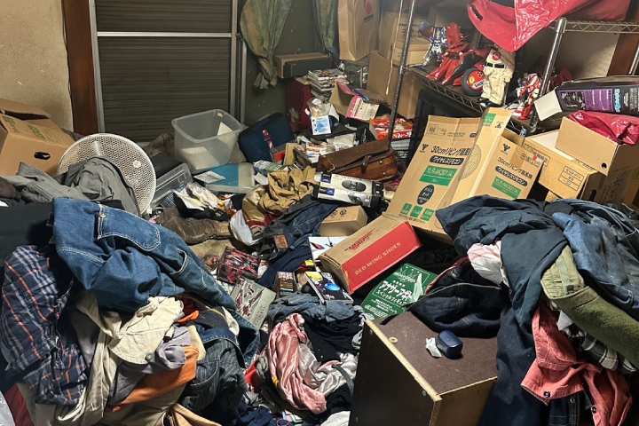 清掃前のお部屋は、床が見えないほど大量の衣類、段ボール、雑誌、生活ゴミで埋め尽くされていました。特に和室は、布団や衣類が山積みになり、壁のシミやカビも目立つ状態で、生活動線が完全に失われていました。