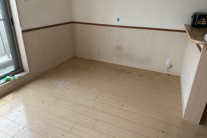 すべてのゴミを搬出した後、厚く積もったゴミの下から久しぶりにフローリングの床が姿を現しました。仕上げに床面の清掃を行うことで、清潔感のあるお部屋へと甦りました。