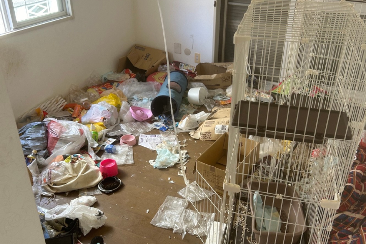 作業前のお部屋は、床一面に袋入りの不用品や日用品、衣類、段ボールなどが置かれており、フローリングの大部分が隠れている状態でした。また、大型のペット用ケージなども設置されており、生活スペースが制限されていました。