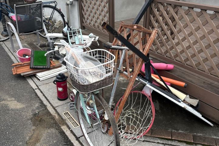 今回の回収品目は、自転車、バスケットゴール、物干し竿、椅子、プラスチックケース、大型ジャグなど多岐にわたります。これらを自治体の粗大ゴミとして出す場合、品目ごとに個別の予約や処理券の購入が必要になり、収集日も指定されるため、出し終わるまでに相応の時間がかかるのが一般的です。