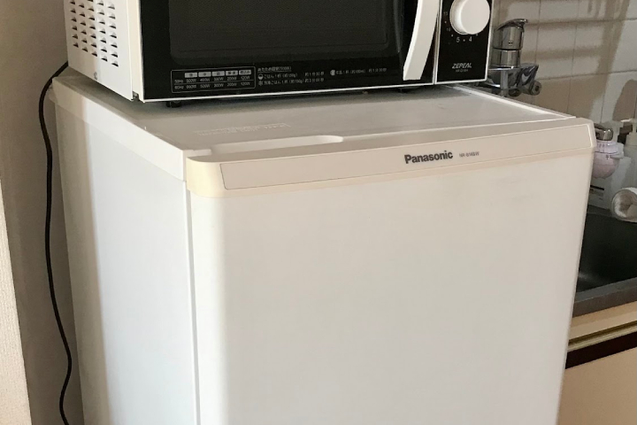 回収品目は、2ドアタイプの冷蔵庫と、その上に設置されていた電子レンジです。冷蔵庫は家電リサイクル法の対象品目であり、自治体の通常のゴミ収集では処分できません。また、重量があるため室内からの運び出しには人手と細心の注意が必要です。