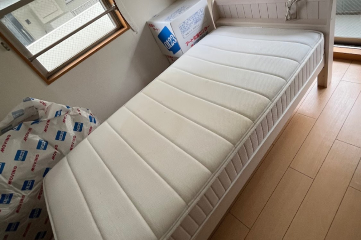 今回の回収品目は、シングルサイズのベッドフレームとマットレスでした。ベッドなどの大型家具は、解体作業が必要な場合や重量があることから、個人での搬出には多大な労力がかかります。また、お引越し当日にこれらの大型品が残っていると、退去の妨げになることもあります。