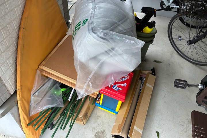 今回の回収品目は、子供用の玩具、園芸用の支柱、ボード類、袋に入った寝具などでした。これらはプラスチック、金属、布など素材が多岐にわたるため、自治体のゴミ収集では「可燃」「不燃」「粗大ゴミ」など細かな分別が求められます。特に園芸資材のような長尺物や、かさばる大型玩具などは、処分の判断や運び出しに手間がかかる傾向にあります。
